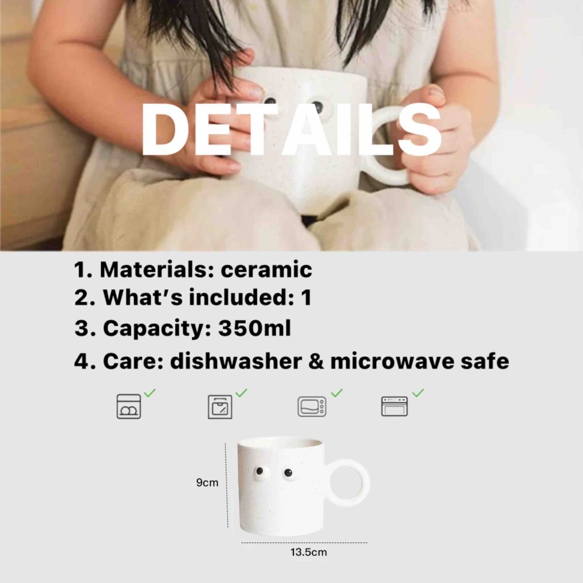 Crafted from durable ceramic and shaped by hand, each piece is slightly unique — full of charm and character. The wide handle makes it easy to hold, while the spacious interior fits your favorite drinks perfectly.